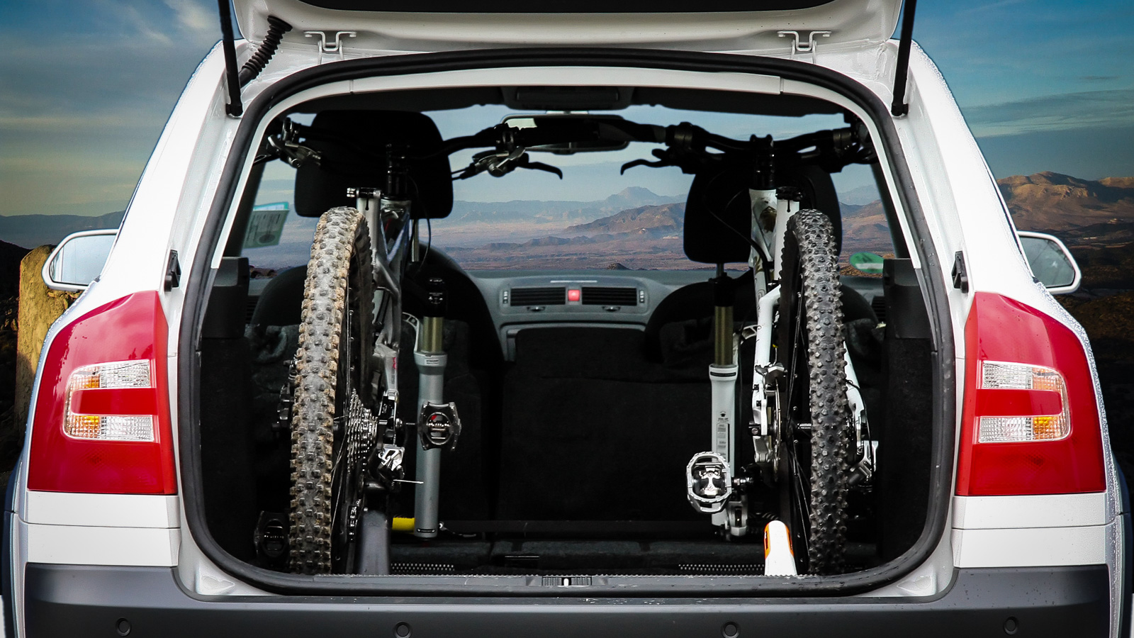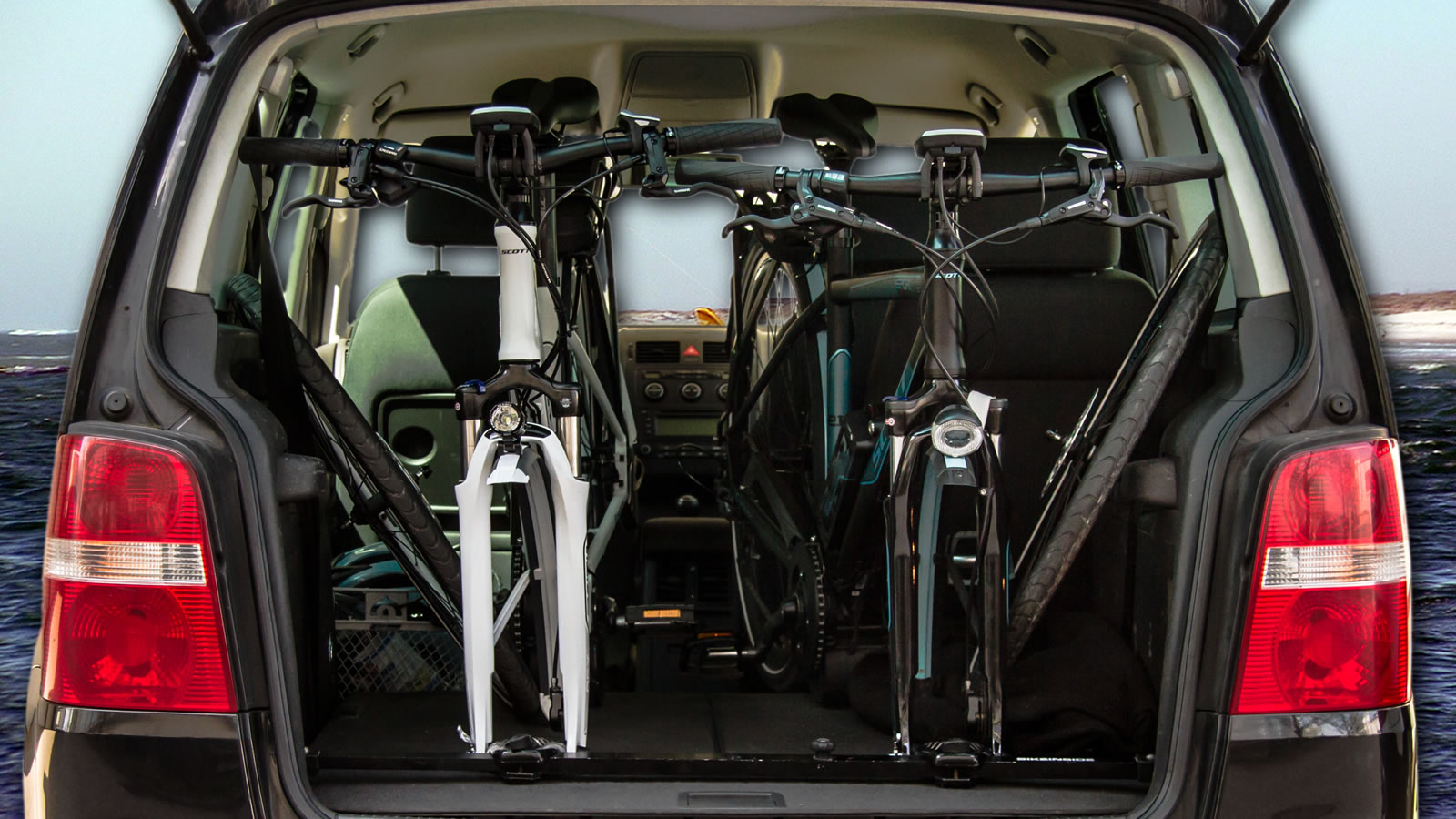 Probieren Sie es einfach aus indem Sie Ihr Bike aufrechtstehend (Vorderrad und eventuell Sattel herausnehmen, wenn nötig Federgabel absenken und Hinterrad herausnehmen) in Ihren VW Caddy Life stellen. Wenn das geht, können Sie den Bikeinside Fahrradträger für den Innenraum in Ihrem VW Caddy Life verwenden!